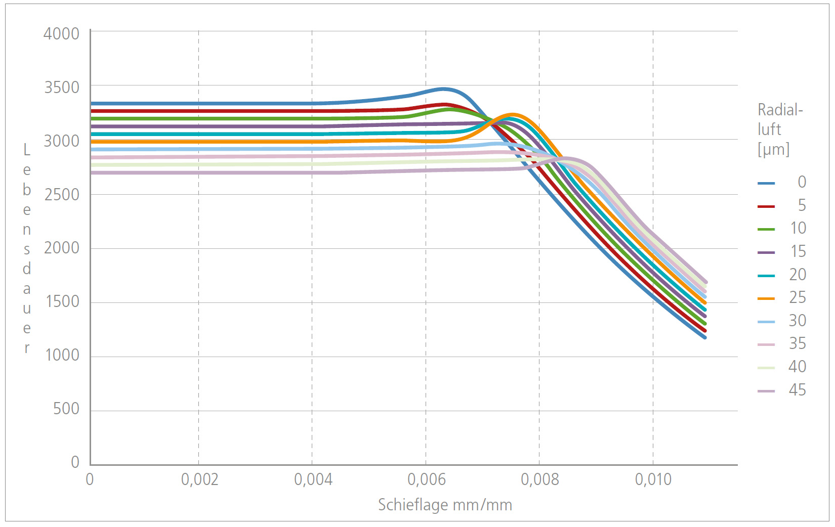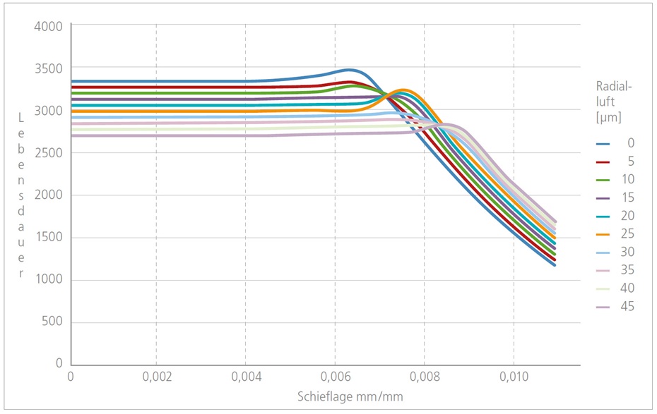 Das LFD-Wälzlagerdesign wird bezüglich Laufbahnschmiegung in Kombination mit dem passenden Lagerspiel optimiert. Denn die Maximierung der Lebensdauer steht in direkter Abhängigkeit mit der Lagerluft. Der Aspekt der Schiefstellung wird mit zunehmender Rollenlänge immer wichtiger, da die Durchbiegung der Tragrollen zu immer größeren Verkippungen in der Lagerstelle führt. LFD berücksichtigt diese Aspekte in der eigenen Produktion.
